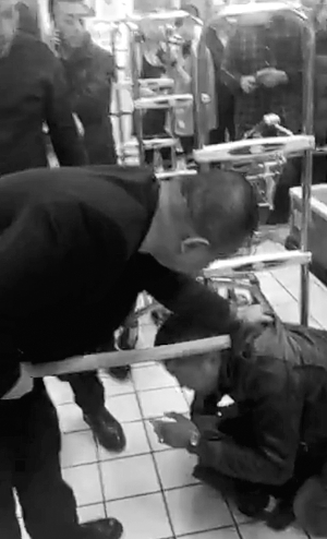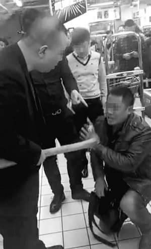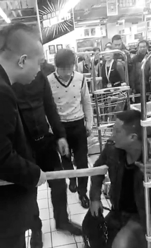 昨天,一段視頻在網(wǎng)上被熱議。“再不松開把你腿削折了”,一棕色外套男子被逼跪在地上,抱著收銀臺附近的欄桿連連承諾“再不來了”。另外兩個大漢在旁拖拽他,其中一人用木棒打向男子,另一人在旁邊踢了該男子一腳,并威脅道:“再來讓你沒命”(如圖)。