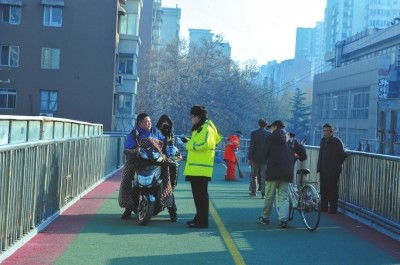 京華時(shí)報(bào)訊(記者張思佳)昨天,朝陽(yáng)呼家樓交通大隊(duì)的交警在雙井橋北一過街天橋上,對(duì)在天橋上騎行電動(dòng)車者進(jìn)行處罰,騎行者當(dāng)場(chǎng)被罰款20元。這是交管部門首次對(duì)電動(dòng)車騎行橫穿過街天橋進(jìn)行處罰。