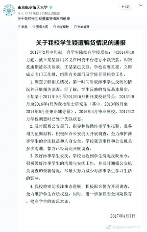 在4月7日下午,“@南京航空航天大學(xué)”官微發(fā)布了“關(guān)于我校學(xué)生疑遭騙貸情況的通報(bào)”,通報(bào)稱,從2017年2月中旬起,有學(xué)生陸續(xù)向?qū)W校反映,自2014年10月底,被王某冒用名義在網(wǎng)貸平臺(tái)進(jìn)行小額貸款,因貸款逾期被多次催款,王某已失聯(lián)。學(xué)校高度重視,立即成立專門工作組,組織有關(guān)部門及學(xué)院開(kāi)展相關(guān)工作。經(jīng)調(diào)查了解,學(xué)生反映的情況基本屬實(shí)。