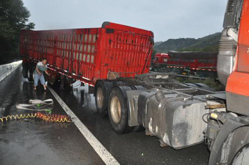 2017年08月26日19時00分許,高速二支隊九大隊民警翟躍、郭騏源接到報警稱:在五保高速8km處,有一輛紅色東風牌重型半掛貨車因出車前未檢查車輛,駕駛存在安全隱患的車輛上路行駛,將掛車脫落,后與中央護欄發(fā)生碰撞,造成車輛及路產不同程度損壞的道路交通事故。大隊民警第一時間趕赴現(xiàn)場,只有超車道可以通行,在做好安全防護的情況下,及時詢問當事人是否受傷,是否需要撥打“120”急救,并了解了當時的事發(fā)情況。當事人稱:“自己一個人開車去陜西拉煤,走的時候著急,沒檢查車輛,在行駛過程中,就感覺車輛掛車在擺動,因為是雨天,也沒在意,行駛到8km處時,踩剎車過急,加之路面濕滑,掛車突然脫落與中央護欄發(fā)生碰撞,所幸人沒有受傷。”之后,民警對現(xiàn)場進行勘查,并調取監(jiān)控視頻,發(fā)現(xiàn)車輛在剎車時,車速較快,駕駛員駕駛存在安全隱患的車輛是造成事故發(fā)生的原因。