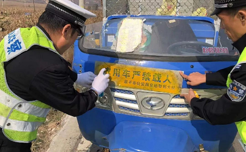 “三輪車結(jié)構(gòu)簡(jiǎn)單,穩(wěn)定性差,機(jī)械強(qiáng)度低,如果駕駛不慎,極易引發(fā)翻車事故,使駕乘人員遭受非常嚴(yán)重的傷害。請(qǐng)三輪車駕駛?cè)俗杂X(jué)遵守交通法規(guī),嚴(yán)禁違法載人”。