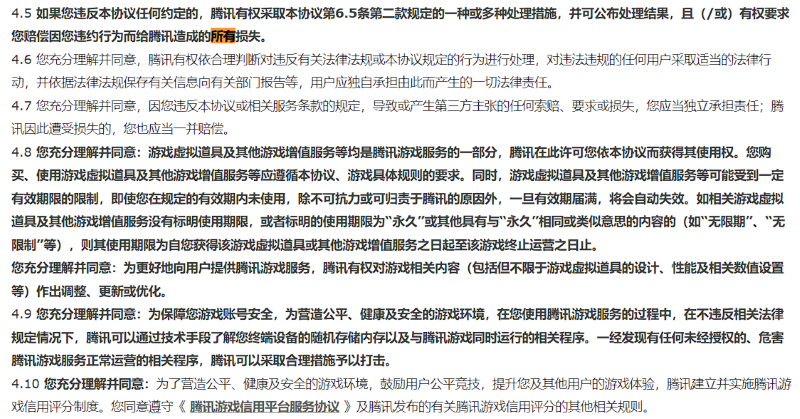 所有網(wǎng)游初次進入游戲都會看到一份密密麻麻的游戲服務協(xié)議,用戶不同意則不能享受游戲內容,包括騰訊在內運營商為什么都這么做?因為國家規(guī)定。根據(jù)《網(wǎng)絡安全法》《互聯(lián)網(wǎng)信息服務管理辦法》《互聯(lián)網(wǎng)用戶賬號信息管理規(guī)定》,互聯(lián)網(wǎng)信息服務提供者應當依照法律法規(guī)有關規(guī)定,制定和公開互聯(lián)網(wǎng)用戶賬號管理規(guī)則、平臺公約,與用戶簽訂服務協(xié)議,明確賬號信息注冊、使用和管理相關權利義務。玩家使用賬號如果違反法律法規(guī)、用戶協(xié)議的,互聯(lián)網(wǎng)信息服務提供者有權采取警示提醒、限期改正、限制賬號功能、暫停使用、關閉賬號、禁止重新注冊等處置措施。