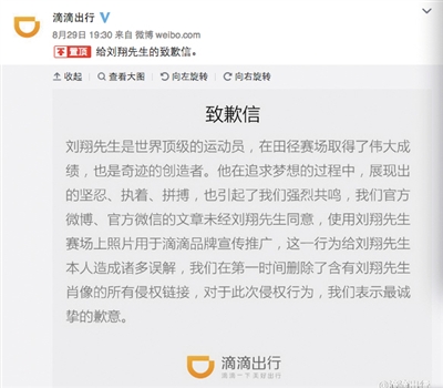 29日晚間,滴滴出行在其官方微博中發(fā)布了“給劉翔先生的致歉信”,承認未經(jīng)同意使用劉翔相關(guān)照片用于推廣,已造成侵權(quán)。新京報記者了解到,另一家涉及侵權(quán)的公司極路由也已向劉翔公開致歉。