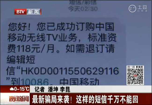 中國經(jīng)濟網(wǎng)北京11月4日訊 “您好!您已成功訂購中國移動無線TV業(yè)務(wù),標準資費118元/月。如需退訂,請編輯短信HK***到10086?!局袊苿印俊?1月2日北京電視臺《晚間新聞》報道,近日,北京市民王小姐收到了“中國移動”發(fā)來的這樣一條服務(wù)訂購短信。
