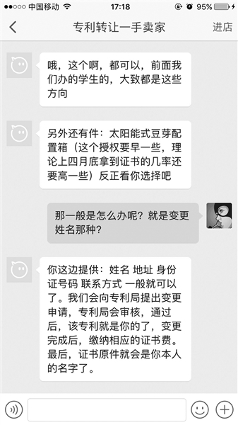 在一家機(jī)構(gòu)網(wǎng)店上,北青報(bào)記者看到,曾經(jīng)購買過“實(shí)用新型專利申請或轉(zhuǎn)讓”的賣家評價(jià)稱,“感覺很方便,不用自己一個(gè)人絞盡腦汁熬夜了,服務(wù)為自己省了很多力,果然人多力量大,相信最后能拿到證書?!?/p>
