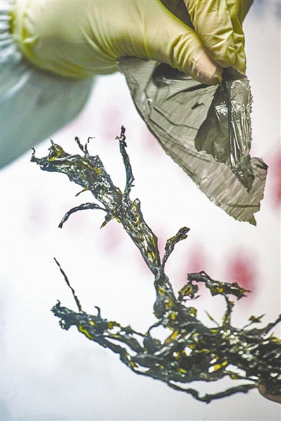 福建省水產(chǎn)加工流通協(xié)會的報告稱,受謠言的影響,該省紫菜產(chǎn)業(yè)保守估計損失將達到數(shù)千萬元甚至上億元。為澄清傳聞,北京、福建、廣東等地近日對市場上的紫菜進行了檢查或?qū)嶒炇诣b定。圖為廣州CEC食品安全檢測中心,對比干的紫菜和薄塑料袋。