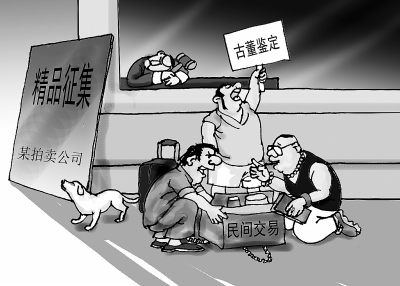 中小拍賣(mài)行大批停業(yè),大拍賣(mài)行又看不上他們的藏品,普通民間收藏者只好在馬路邊交易。漫畫(huà) 王鵬