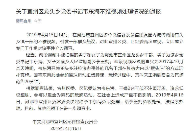 4月16日,中共河池市宜州區(qū)紀(jì)律檢查委員會(huì)發(fā)布通報(bào)。2019年4月15日14時(shí),在廣西河池市宜州區(qū)多個(gè)微信群及微信朋友圈內(nèi)流傳兩段有關(guān)鄉(xiāng)鎮(zhèn)干部的不雅視頻, 經(jīng)查,兩段視頻中被拍攝的男子和女子為河池市宜州區(qū)龍頭鄉(xiāng)干部,男子為該鄉(xiāng)黨委書記韋東海,女子為該鄉(xiāng)人民政府副鄉(xiāng)長王娟。兩段視頻反映的事實(shí)為2017年10月某天晚間,韋東海召集龍頭鄉(xiāng)駐拉浪辦事處的幾名干部在其宿舍內(nèi)以“擺頭注”的方式玩撲克牌。因韋東海此前參加籃球運(yùn)動(dòng)扭傷腳踝,玩牌過程中,其叫來王娟到宿舍為其搽藥約20分鐘。