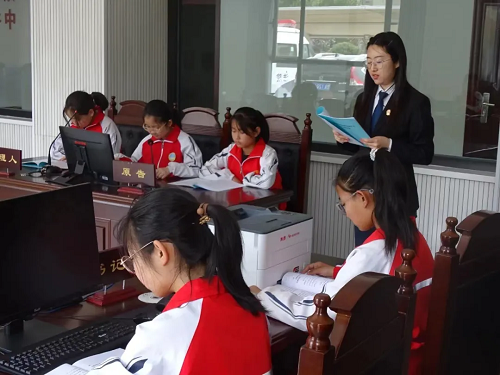 隨后,學(xué)生們?cè)趯徟蟹ㄍヅe行了模擬法庭活動(dòng),他們分別擔(dān)任審判長(zhǎng)、審判員、書記員、代理人、原被告等不同的法庭角色,法院干警還向大家分發(fā)了《山西法院保護(hù)未成年人十大典型案例》,并進(jìn)行模擬講解。