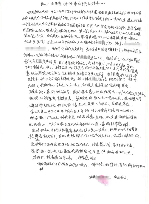 10月9日,忻州市公安局反詐中心收到了受害人親筆寫下的感謝信,信中表達(dá)了對忻州反詐民警真誠而濃厚的謝意。