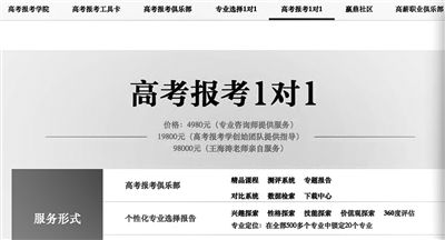 北青報(bào)記者發(fā)現(xiàn),面對(duì)考生家長(zhǎng)對(duì)于志愿填報(bào)的“迫切需求”,目前高考志愿填報(bào)咨詢的價(jià)格都在幾千元到幾萬(wàn)元不等。這位潘姓工作人員表示,該機(jī)構(gòu)設(shè)有線上、線下志愿填報(bào)兩套方案,其中線上填報(bào)方案價(jià)格為3980元,志愿填報(bào)咨詢老師與學(xué)生并不見(jiàn)面,而是通過(guò)QQ、郵件等方式為學(xué)生和家長(zhǎng)出具志愿填報(bào)方案。而線下志愿填報(bào)方案為1對(duì)1有針對(duì)性的填報(bào),但是根據(jù)咨詢經(jīng)驗(yàn)的多寡收費(fèi)也不相同?!氨热缥覀冇衅甙四晷袠I(yè)經(jīng)驗(yàn)的呂老師收費(fèi)是22800元,有6年經(jīng)驗(yàn)的郭老師收費(fèi)是20800元,要是有3年經(jīng)驗(yàn)的李老師收費(fèi)則為16800元?!贝送?,一家名為融聚未來(lái)的機(jī)構(gòu)的高姓負(fù)責(zé)人也向記者介紹,該機(jī)構(gòu)高考志愿填報(bào)1對(duì)1服務(wù)的價(jià)格在8000元到2萬(wàn)元以內(nèi)。最讓人吃驚的是,一家名為贏鼎教育的高考報(bào)考機(jī)構(gòu),在官網(wǎng)上明示的高考報(bào)考1對(duì)1項(xiàng)目中明確標(biāo)價(jià),專業(yè)咨詢師提供服務(wù)的收費(fèi)4980元,高考報(bào)考學(xué)創(chuàng)始團(tuán)隊(duì)提供指導(dǎo)的收費(fèi)為19800元,王海濤老師親自服務(wù)的標(biāo)價(jià)為98000元。
