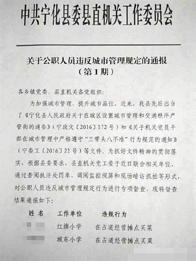 爭議由一份通報文件開始。網(wǎng)傳圖片顯示,一份抬頭為“中共寧化縣委縣直機(jī)關(guān)工作委員會”的《關(guān)于公職人員違反城市管理規(guī)定的通報》中,寧化縣針對公職人員違反城市管理規(guī)定行為進(jìn)行專項(xiàng)督查,并對部分公職人員進(jìn)行了公開通報。其中,文件第一頁列明,兩名工作單位分別為紅旗小學(xué)和城東小學(xué)的教師,因?yàn)椤霸谡嫉澜?jīng)營攤點(diǎn)買菜”的違規(guī)行為,受到通報處理。