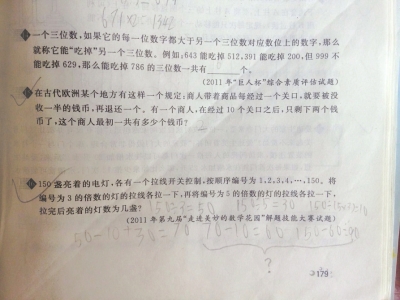 “150盞亮著的電燈,各有一個拉線開關(guān)控制,被順序編號為1,2,3,4,…,150。將編號為3的倍數(shù)的燈的拉線各拉一下,再將編號為5的倍數(shù)的拉線各拉一下,拉完后亮著的燈數(shù)為幾盞?”這是一道考公因數(shù)和公倍數(shù)的思維數(shù)學題,今年暑假,才上完三年級的羅弋在做四年級的數(shù)學競賽題集《培優(yōu)新幫手》時遇到此題,算出答案“90”與標準答案“80”不符,媽媽陳群只當兒子錯了。