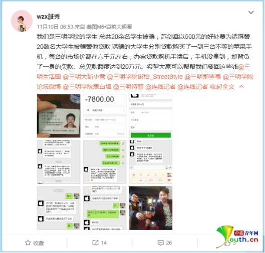 近日福建三明學(xué)院有學(xué)生發(fā)微博稱,自己與多名同學(xué)被誘騙貸款買手機,辦完貸款購機手續(xù)后,手機沒拿到卻背了一身債務(wù)。20名大學(xué)生總欠款額度達(dá)20多萬。