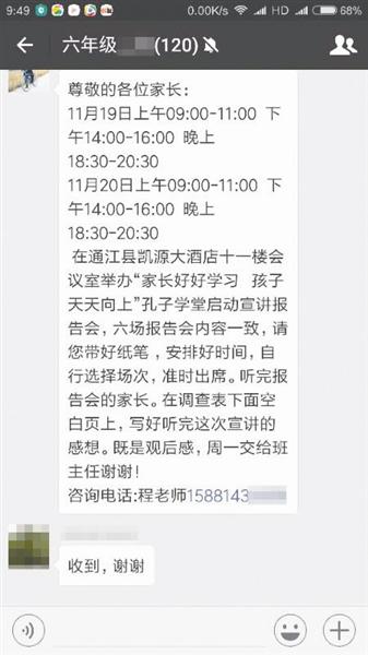 但23日上午,陳姓負責(zé)人又否認了22日的說法,表示學(xué)校并沒有發(fā)調(diào)查表,沒有為家長推薦公益講座,“不曉得”,也沒有讓家長寫觀后感。對于教師在群里發(fā)信息讓家長到會聽講座的事情不予回應(yīng)。