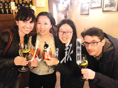 孫雅靜(右二)和同學(xué)教房東夫婦做完西紅柿雞蛋面后,他們舉杯慶祝。(圖片由受訪者提供)