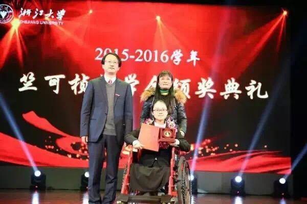 竺可楨獎(jiǎng)學(xué)金是浙江大學(xué)最高層次的獎(jiǎng)學(xué)金,要通過(guò)本人申請(qǐng),學(xué)院(系)推薦,校獎(jiǎng)學(xué)金評(píng)審委員會(huì)評(píng)定,每次評(píng)選全校范圍內(nèi)的研究生只有12個(gè)名額。在2016年10月份公布的獲獎(jiǎng)?wù)咧?,葉沈俏名列其中。“自己算比較幸運(yùn)的,還能看書,可以打字。”葉沈俏說(shuō),“同學(xué)和老師還是很關(guān)愛我的,努力學(xué)習(xí)、認(rèn)真科研是向他們表達(dá)感謝的手段,這也是我最好的興趣?!眻D為浙江大學(xué)校長(zhǎng)吳朝暉為葉沈俏頒發(fā)竺可楨獎(jiǎng)學(xué)金。