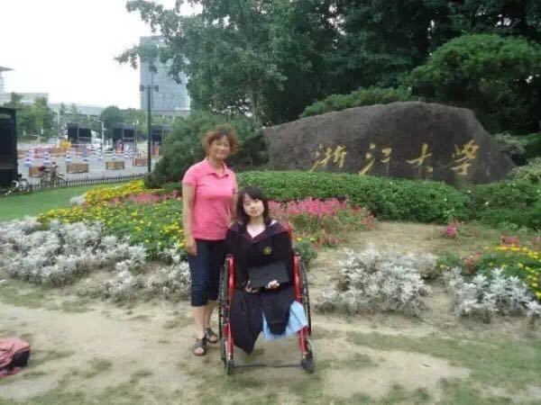 高考時(shí),葉沈俏以全省名次靠前的優(yōu)異成績(jī),被浙江大學(xué)錄取。如愿被浙大錄取后,那年初秋,葉媽媽就開始背著葉沈俏穿梭在浙大紫金港校區(qū)各個(gè)教室上課。“我媽媽是我的一個(gè)勇敢的榜樣,身體力行地告訴我,我可以依靠自己的努力做一個(gè)獨(dú)立有價(jià)值的人?!比~沈俏說(shuō)。2010年的一次期末考試后,天空正在下雪,越來(lái)越大,別的同學(xué)早已急匆匆地考完試回家。地滑路濕,葉媽媽便穿上雨衣推著輪椅慢慢走在浙大校園里。葉沈俏說(shuō):“那一刻我覺得自己是最幸福的人,我不能放棄,而要更加努力?!眻D為葉沈俏本科畢業(yè)時(shí)與母親的合照。