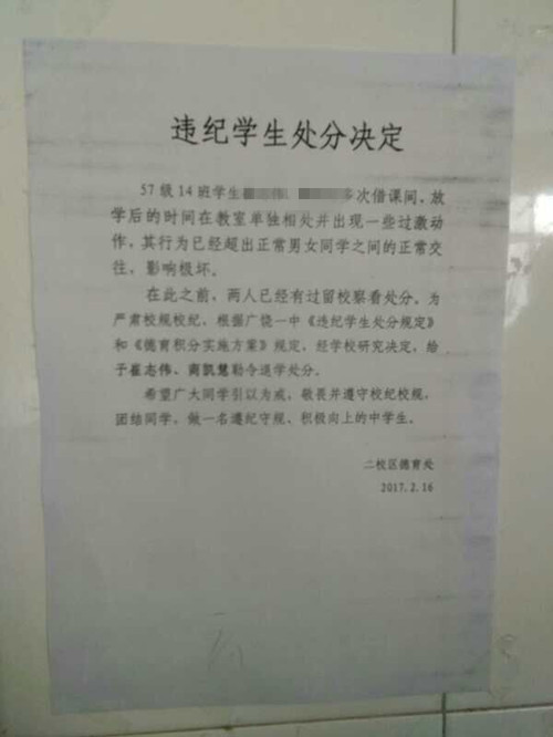 17日晚,商先生向大眾網(wǎng)記者提供了一份落款為二校區(qū)德育處的違紀(jì)學(xué)生處分決定,大體內(nèi)容為:57級(jí)14班學(xué)生阿強(qiáng)(化名)、小芳多次借課間、放學(xué)后的時(shí)間在教室單獨(dú)相處并出現(xiàn)一些過(guò)激動(dòng)作,其行為已經(jīng)超出正常男女同學(xué)之間的正常交往,影響極壞。在此之前,兩人已經(jīng)有過(guò)留校察看處分。為嚴(yán)肅校規(guī)校紀(jì),根據(jù)廣饒一中《違紀(jì)學(xué)生處分規(guī)定》和《德育積分實(shí)施方案》規(guī)定,經(jīng)學(xué)校研究決定,給予兩人勒令退學(xué)處分。