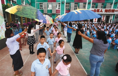2016年9月1日,海淀區(qū)雙榆樹(shù)一小,家長(zhǎng)撐起手繪的傘歡迎一年級(jí)新生。按照北京市當(dāng)時(shí)規(guī)定,凡年滿(mǎn)6周歲(2010年8月31日以前出生)的兒童參加信息采集,不滿(mǎn)6周歲(2010年8月31日以后出生)的兒童不能采集。資料圖片/新京報(bào)記者 浦峰 攝