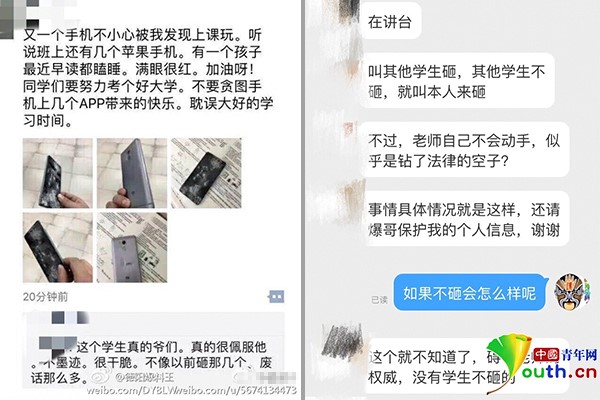 據(jù)微博內(nèi)容顯示,德陽一中學(xué)老師發(fā)現(xiàn)學(xué)生上課玩手機(jī)后要求學(xué)生將手機(jī)砸壞,事后在朋友圈贊賞該同學(xué)“耿直”,這種做法也引來爭(zhēng)議。有人表示,砸手機(jī)能讓學(xué)生記住教訓(xùn),避免再犯。而有的學(xué)生則表示,直接砸手機(jī)這種做法太過簡(jiǎn)單粗暴,也可以交給家長(zhǎng),畢竟手機(jī)價(jià)格也不低。