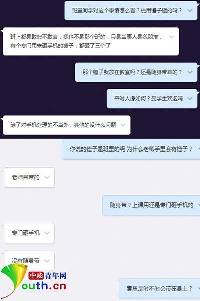 另一位目睹當(dāng)晚情況的同學(xué)向中國(guó)青年網(wǎng)記者反映,手機(jī)是被老師拿錘子砸的,該老師男性,其專門備有一個(gè)砸手機(jī)的錘子。雖然老師平時(shí)對(duì)學(xué)生們很嚴(yán)厲,但教學(xué)水平很不錯(cuò)。這次雖然學(xué)生有錯(cuò),但老師砸手機(jī)的處理方式有些欠妥。