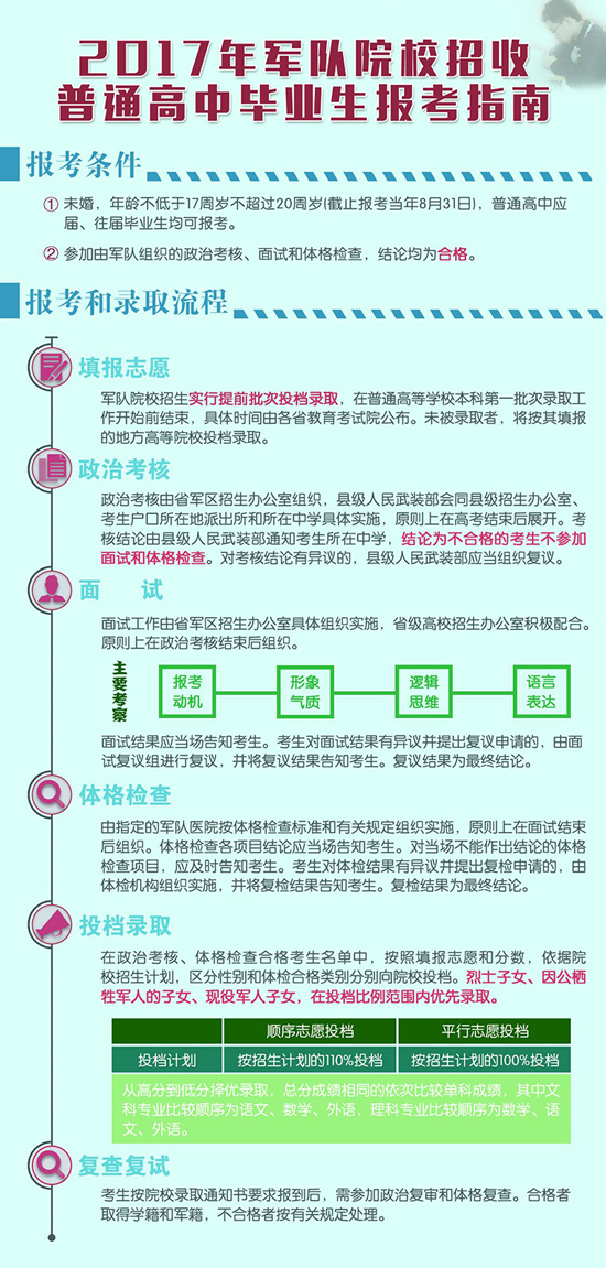深入推進(jìn)陽光招生。據(jù)了解,軍委機(jī)關(guān)業(yè)務(wù)部門將采取四項(xiàng)措施,深入推進(jìn)軍隊(duì)院校招生工作陽光工程。一是加大信息公開力度。進(jìn)一步健全完善以政策規(guī)定、招生計(jì)劃、考生資格、考試成績、錄取信息、申訴渠道和違規(guī)處理為主要內(nèi)容的信息公開制度,做到全過程跟進(jìn)、全媒體覆蓋、全要素公開,在招生錄取的各個(gè)關(guān)鍵環(huán)節(jié),全面及時(shí)發(fā)布權(quán)威資訊,搞好政策解讀和宣傳引導(dǎo),擴(kuò)大信息公開公示的覆蓋面。二是強(qiáng)化運(yùn)行過程管控。扭住重點(diǎn)關(guān)鍵環(huán)節(jié)細(xì)化責(zé)任、加強(qiáng)管控、不留死角。青年學(xué)生招生重點(diǎn)是政治考核、面試體檢、投檔錄取等環(huán)節(jié),士兵學(xué)員招生重點(diǎn)是選拔推薦、考務(wù)組織、集中錄取等環(huán)節(jié)。通過教育和培訓(xùn)相結(jié)合、人防和技防相結(jié)合、檢查和問責(zé)相結(jié)合,堅(jiān)決杜絕各種違規(guī)違紀(jì)現(xiàn)象發(fā)生。三是實(shí)行聯(lián)合檢查督導(dǎo)。加強(qiáng)招生工作專項(xiàng)檢查督導(dǎo),軍地有關(guān)部門、軍隊(duì)各級(jí)職能部門組成聯(lián)合檢查組,不打招呼式開展巡視督導(dǎo)。四是堅(jiān)持從嚴(yán)執(zhí)紀(jì)問責(zé)。對(duì)查證屬實(shí)的違規(guī)違紀(jì)問題,依法依紀(jì)嚴(yán)肅處理,倒查追究有關(guān)單位和個(gè)人責(zé)任。