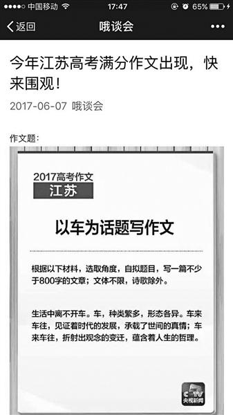 6月7日中午,全國高考語文考試科目結(jié)束,各地高考語文作文題目隨之在網(wǎng)絡(luò)上刷屏,據(jù)央視新聞微博消息,江蘇省的作文題目是“以車為話題寫作文”。