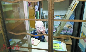 孫開俊的家位于海珠區(qū)昌崗中路一個(gè)宿舍區(qū)的首層。走進(jìn)他家客廳,最顯眼的就是開俊從小到大的照片和獎(jiǎng)狀,有學(xué)校的獎(jiǎng)狀,也有參加圍棋比賽、殘障人士跑步比賽等的獎(jiǎng)狀,一面墻的正中間還掛著一幅歌德的名言——“目標(biāo)越接近,困難越增加”?!斑@是開俊自己選的。”孫爸爸說。走進(jìn)房間,原本堆滿雜物的書桌已經(jīng)被改造成明亮寬敞的專屬學(xué)習(xí)的空間,開俊正用助視器專注讀書。