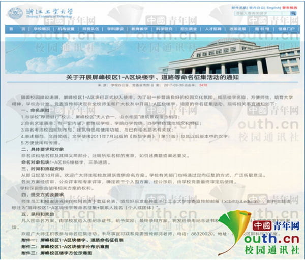圖為該校官網(wǎng)關(guān)于新區(qū)樓宇、道路征名的通知。中國青年網(wǎng)通訊員 李世芳 提供