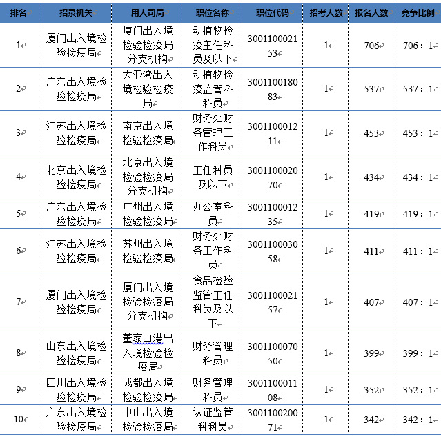 最受考生歡迎的出入境相關(guān)崗位,絕大多數(shù)都位于江浙閩粵京魯?shù)劝l(fā)達(dá)地區(qū),雖然已經(jīng)表現(xiàn)出很大的競(jìng)爭趨勢(shì),但報(bào)名人數(shù)一漲再漲。截止到11月5日16:00,廈門出入境檢驗(yàn)檢疫局分支機(jī)構(gòu)動(dòng)植物檢疫主任科員及以下崗位持續(xù)領(lǐng)跑,成為出入境各部門報(bào)名人數(shù)最多、競(jìng)爭比例最高“雙高”職位,競(jìng)爭比例攀升至達(dá)706:1。大亞灣出入境檢驗(yàn)檢疫局動(dòng)植物檢疫監(jiān)管科科員崗位緊跟其后,競(jìng)爭比例達(dá)到537:1。競(jìng)爭比超過400:1的崗位已經(jīng)達(dá)到了7個(gè)。具體數(shù)據(jù)可參見表1。