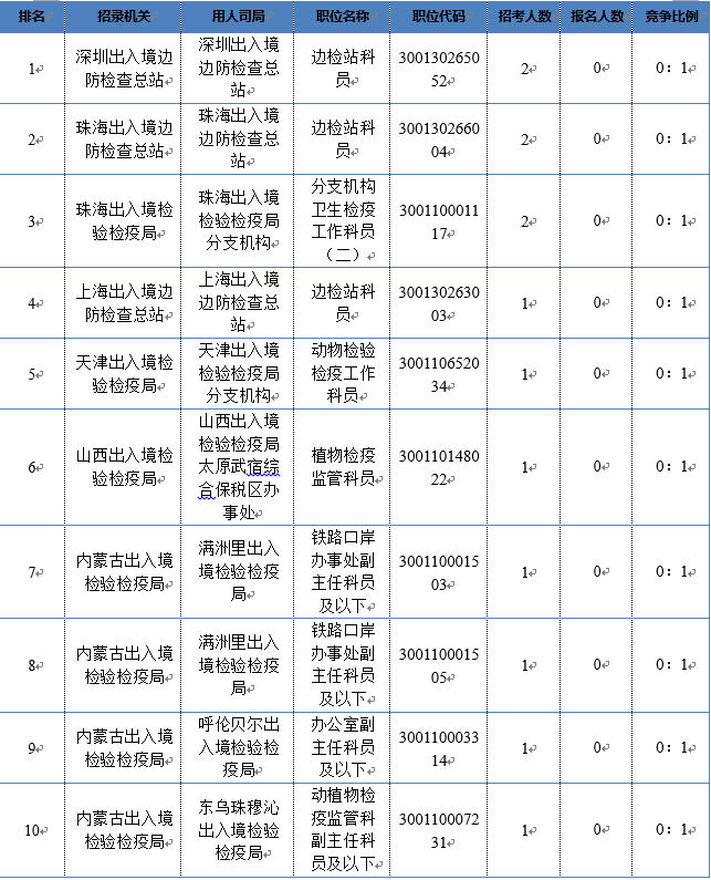 2018國考出入境各部門暫無人報(bào)考十大職位(數(shù)據(jù)截至11月5日16:00,按招錄人數(shù)排名)