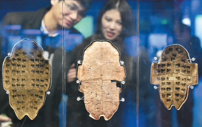 圖為游客在位于河南省安陽市的殷墟博物館中參觀刻有甲骨文的卜甲。新華社發(fā)(李嘉南攝)