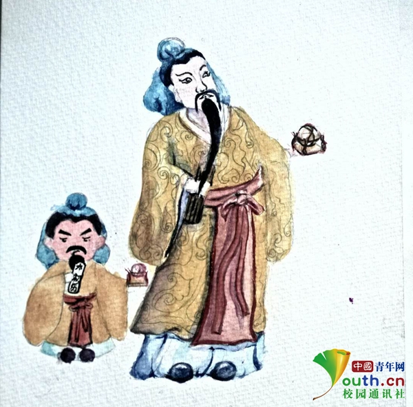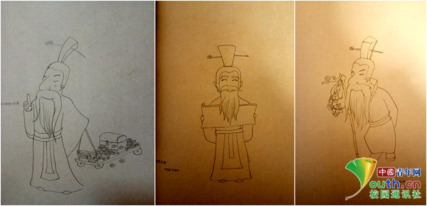 該校環(huán)境藝術(shù)設(shè)計(jì)專業(yè)大三同學(xué)徐茂寧眼中的“春節(jié)老人”是比較仙風(fēng)道骨,有古詩(shī)文中大文學(xué)家的形象?!拔宜鶆?chuàng)作的‘春節(jié)老人’右手執(zhí)太初歷,左手執(zhí)渾儀,點(diǎn)出了落下閎老人對(duì)中國(guó)古老傳統(tǒng)節(jié)日的突出貢獻(xiàn)?!?徐茂寧說(shuō),她創(chuàng)作的時(shí)候認(rèn)為“春節(jié)老人”落下閎的形象應(yīng)該采用中國(guó)畫傳統(tǒng)畫法。
