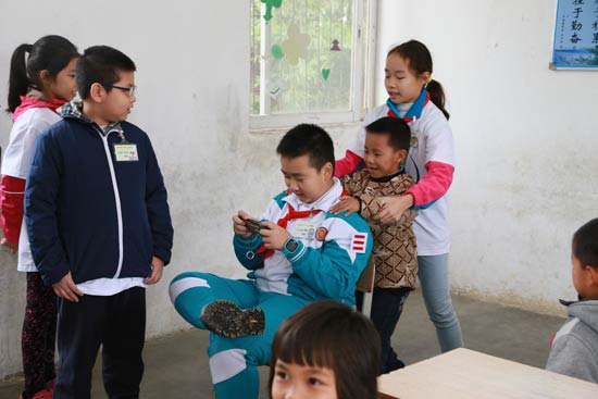 廣東省廣州市的小學(xué)生到廣東清遠(yuǎn)的山村小學(xué)支教,為山村留守兒童上網(wǎng)絡(luò)安全課。圖為“小講師”們演出情景劇模擬孩子們玩游戲時的不良姿勢,讓學(xué)生們糾正。趙暉/攝