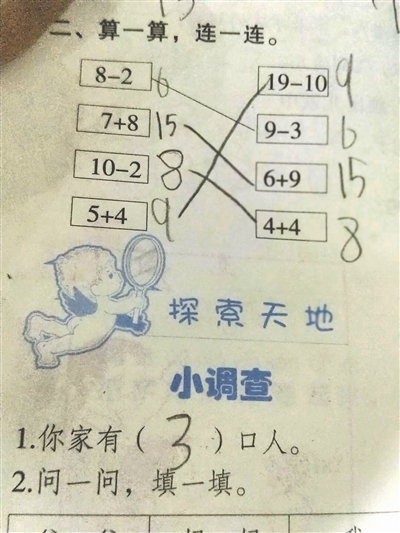 事情發(fā)生在今年1月31日下午,正準(zhǔn)備在單位值夜班的羅俊,收到妻子羅女士發(fā)來的微信,羅女士把大兒子強(qiáng)強(qiáng)做過的填空題照片發(fā)給丈夫看。照片上,在上一道算術(shù)連線題中,強(qiáng)強(qiáng)全部答對。而在下一道填空題中,“你家有()口人”的問題上,強(qiáng)強(qiáng)卻寫了一個(gè)“3”,正確答案應(yīng)該是“4”——爸爸、媽媽、他和妹妹。