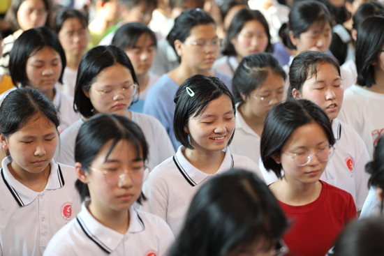 6月28日,湖南永州道縣第一中學(xué)學(xué)生在緊張準(zhǔn)備高考的同時(shí),參加心理講座,開展快樂減壓活動(dòng)。視覺中國供圖