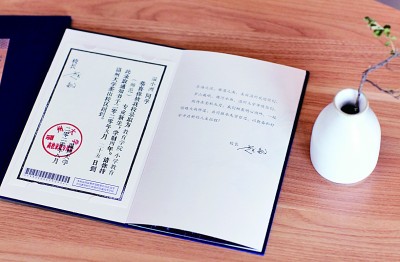 在溫州大學(xué)本科招生錄取現(xiàn)場(chǎng),一本本藍(lán)色燙金的錄取通知書(shū)正整整齊齊地?cái)[放在會(huì)議桌上,整裝待發(fā)。通知書(shū)整體采用中國(guó)傳統(tǒng)文書(shū)褶子樣式,封面是燙金的“錄取通知書(shū)”和學(xué)校?;?,封底是王蒙題詞的校訓(xùn)“求學(xué)問(wèn)是,敢為人先”。展開(kāi)五折折頁(yè),正面分別是瑞安市東源村木活字傳承人親手印刷的錄取證書(shū)頁(yè)、校長(zhǎng)寄語(yǔ)、校歌,背面則是以溫州地理標(biāo)志大羅山為底、溫大建筑為前景的山水畫(huà)卷。