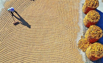 山東省臨沂市郯城縣郯城街道的農民在晾曬玉米。新華社發(fā)