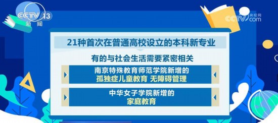 21種首次在普通高校設(shè)立的本科新專業(yè),有的與社會(huì)生活需要緊密相關(guān),比如南京特殊教育師范學(xué)院新增的孤獨(dú)癥兒童教育、無(wú)障礙管理,中華女子學(xué)院新增的家庭教育;有的與城鄉(xiāng)建設(shè)緊密相關(guān),比如海南大學(xué)新增的鄉(xiāng)村治理,北京林業(yè)大學(xué)新增的國(guó)家公園建設(shè)與管理;還有的與前沿技術(shù)發(fā)展緊密相關(guān),比如,清華大學(xué)新增的地球系統(tǒng)科學(xué),華南理工大學(xué)新增的生物材料,東南大學(xué)新增的未來(lái)機(jī)器人、電動(dòng)載運(yùn)工程。