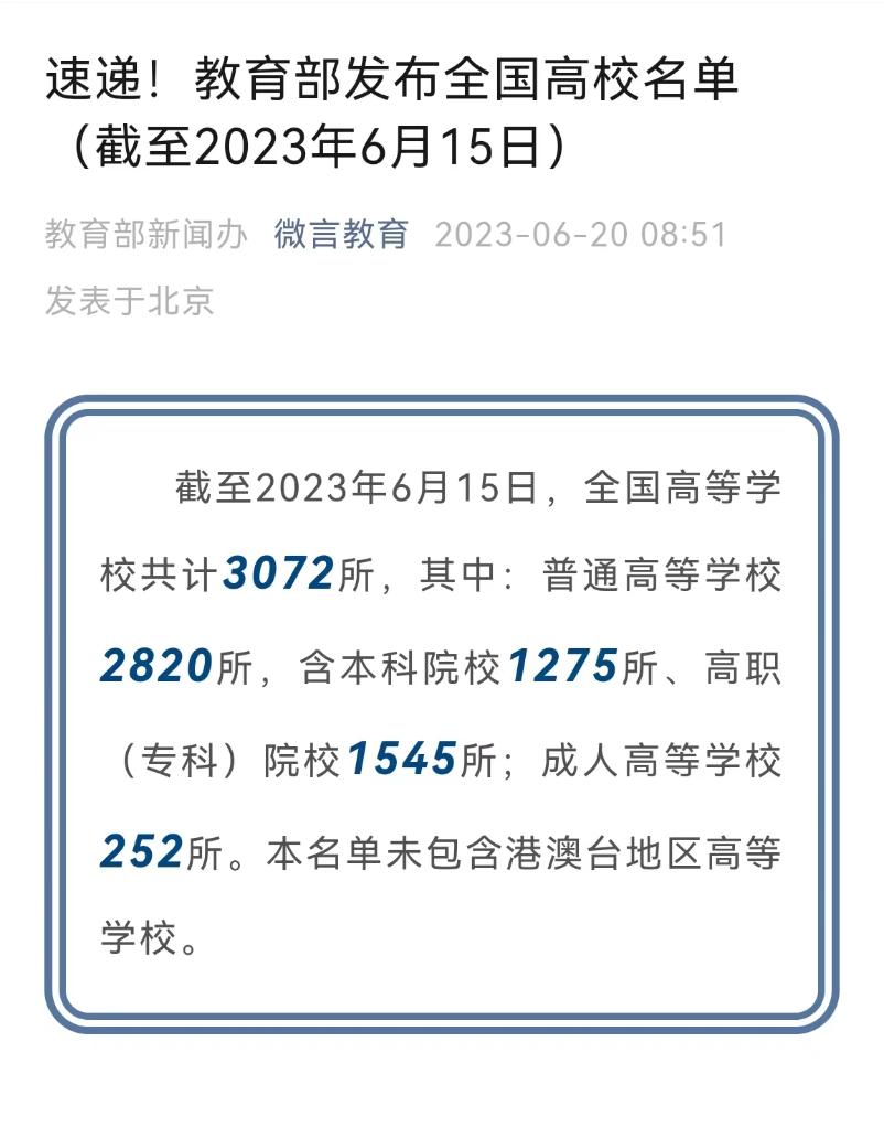 記者6月20日從教育部獲悉,根據(jù)近日發(fā)布的全國(guó)高校名單,截至2023年6月15日,全國(guó)高等學(xué)校共計(jì)3072所,其中普通高等學(xué)校2820所,含本科院校1275所、高職(??疲┰盒?545所;成人高等學(xué)校252所。