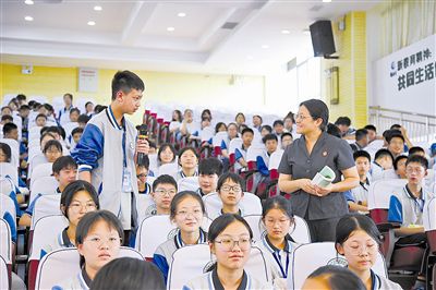 為增強(qiáng)青少年法治觀念,預(yù)防未成年人違法犯罪,構(gòu)建安全和諧的校園環(huán)境,近日,江蘇省鹽城市大豐區(qū)人民法院法官走進(jìn)鹽城市大豐區(qū)城東實(shí)驗(yàn)初級(jí)中學(xué),為該校400多名師生上了秋季開學(xué)法治第一課。圖為學(xué)生發(fā)言提問法官解答。