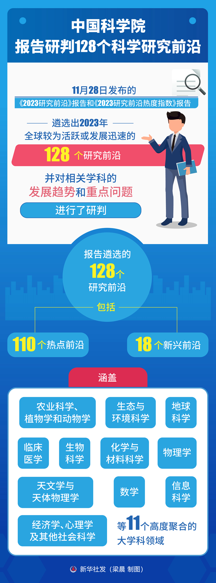 報告遴選的128個研究前沿包括110個熱點前沿和18個新興前沿,涵蓋農(nóng)業(yè)科學、植物學和動物學,生態(tài)與環(huán)境科學,地球科學,臨床醫(yī)學,生物科學,化學與材料科學,物理學,天文學與天體物理學,數(shù)學,信息科學,經(jīng)濟學、心理學及其他社會科學等11個高度聚合的大學科領域。