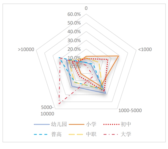 從家庭負(fù)擔(dān)的角度分析,各學(xué)段家庭教育負(fù)擔(dān)率最低的是義務(wù)教育階段,其次是學(xué)前教育階段。高中學(xué)段、大學(xué)學(xué)段家庭負(fù)擔(dān)率上升。到大學(xué)階段,家庭教育負(fù)擔(dān)率上升,“學(xué)前教育的負(fù)擔(dān)與高中接近”。研究發(fā)現(xiàn),農(nóng)村家庭,每一個(gè)大學(xué)在校生的教育支出占全家總支出的35%。