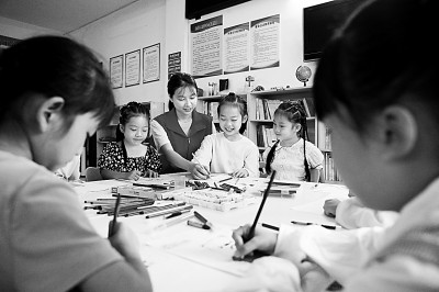 貴州省赤水市復(fù)興鎮(zhèn)新興社區(qū)“童伴媽媽”輔導(dǎo)孩子們繪畫(huà)。新華社發(fā)