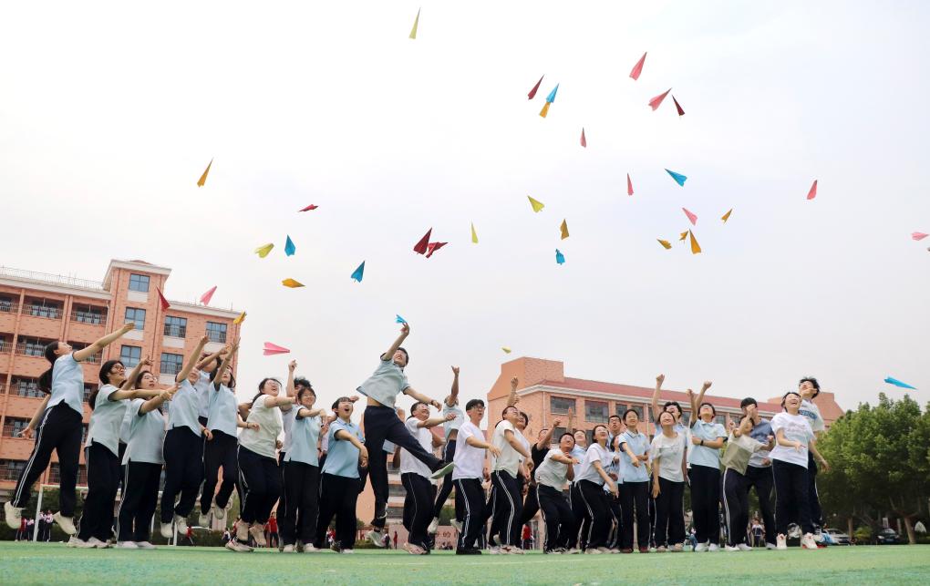 5月22日,在山東省高密市第五中學(xué),高三學(xué)生將寫有夢想的紙飛機(jī)拋向空中。高考臨近,各地學(xué)校組織高三學(xué)生開展不同形式的減壓活動,幫助學(xué)生放松心情,迎接高考。新華社發(fā)(李海濤攝)
