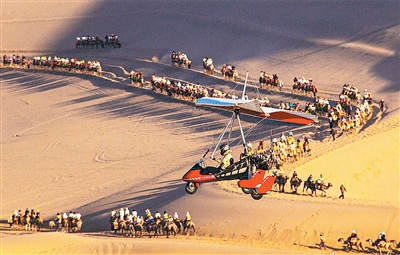 近年來,在甘肅省敦煌市鳴沙山月牙泉景區(qū)運營的敦煌“飛天”通用航空項目,為游客提供低空飛行器旅游服務(wù),讓游客乘坐直升機、動力滑翔機,從空中欣賞大漠綠洲和月牙泉美景,沉浸式體驗敦煌獨特魅力。圖為7月3日,游客乘坐滑翔機空中俯瞰敦煌大漠風光。王斌銀攝(人民視覺)