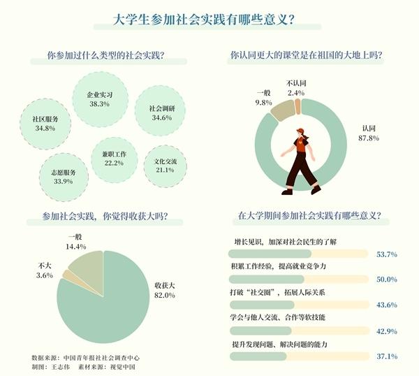 調(diào)查顯示,87.8%的受訪大學(xué)生認(rèn)同,更大的課堂在祖國的大地上。對(duì)于參加社會(huì)實(shí)踐的意義,受訪大學(xué)生把增長(zhǎng)見識(shí),加深對(duì)社會(huì)民生的了解排在首位,獲選率為53.7%,積累工作經(jīng)驗(yàn),提高就業(yè)競(jìng)爭(zhēng)力(50.0%),打破“社交圈”,拓展人際關(guān)系(43.6%)分別排在第二、三位。