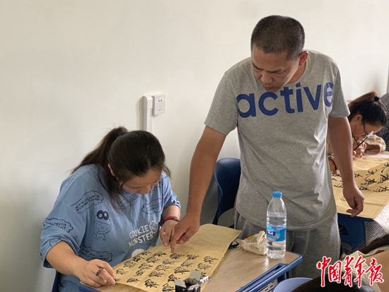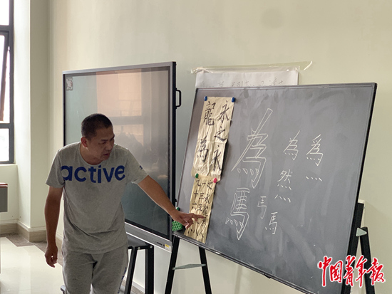 蔡偉給學(xué)生上書法課。