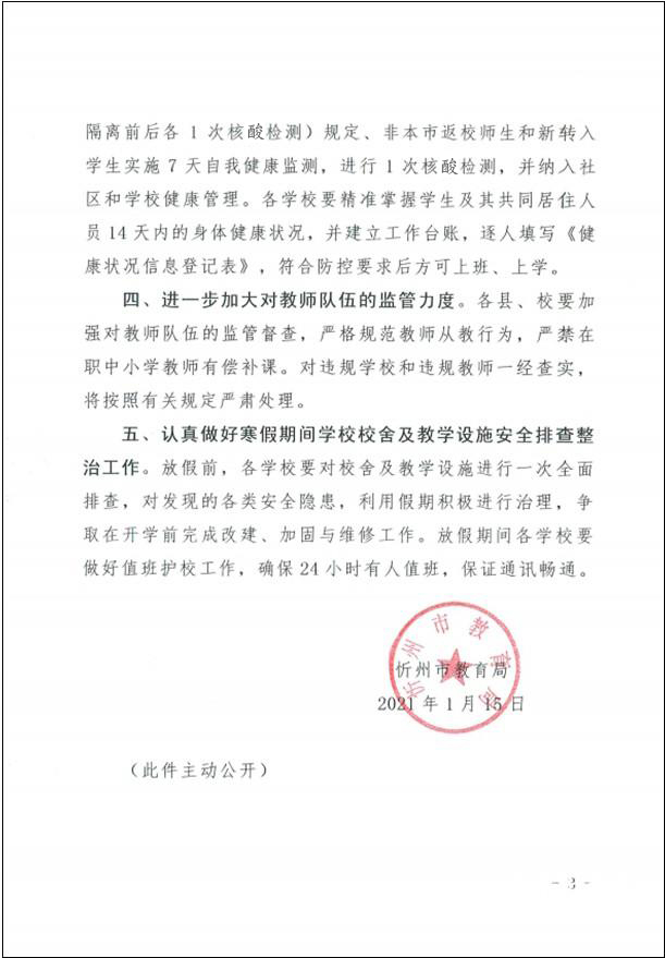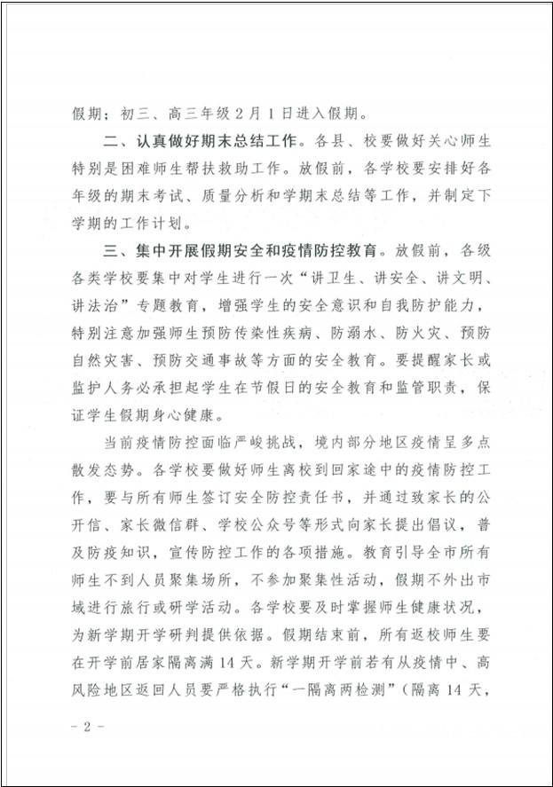 根據(jù)省、市疫情防控工作領(lǐng)導(dǎo)小組及省教育廳視頻會(huì)議精神和我市新冠疫情防控最新形勢(shì),為保障全市師生生命安全和身體健康;經(jīng)市委、市政府同意,現(xiàn)將2021年寒假及假期前后工作安排如下,請(qǐng)遵照?qǐng)?zhí)行。